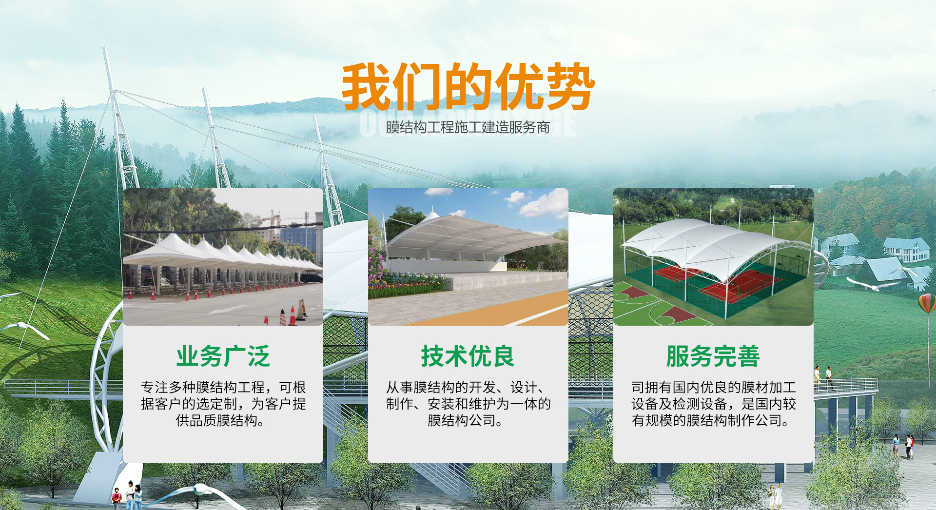 本公司拥有一支管理严格、技术过硬、施工严谨的工程制作、安装队伍,从而保证了设计、制作、施工的每个环节的质量。公司坚持创新的理念,优良的技术人员对膜材每个工艺细节的不断实践创新,建筑是城市的形象,在我们对产品、服务的不断创新,我们能为您的生活增添一道更美的风景,相信公司的产品,能让您与城市共享,愿与您共筑美好明天!